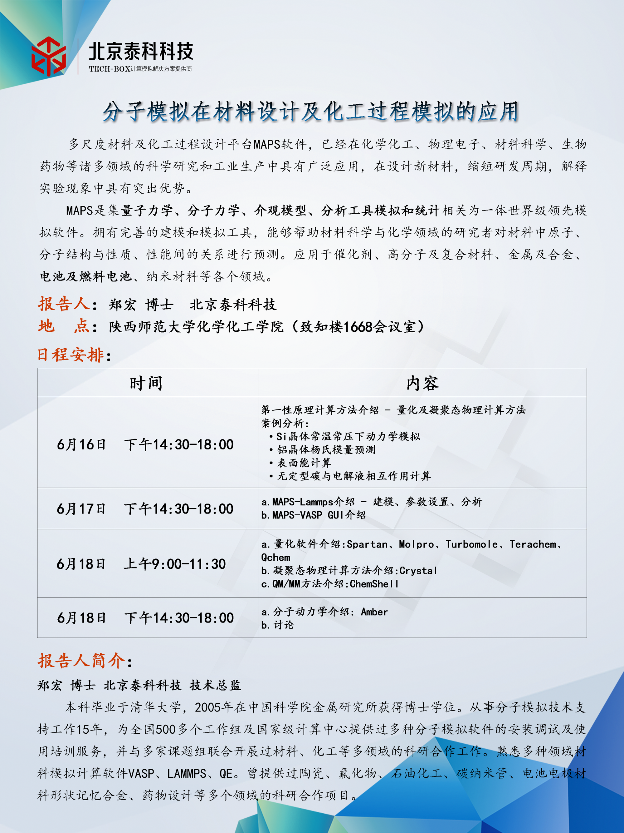 蘑菇视频 计算化学和分子模拟共享平台(1768室)已经通过学校的验收,现准备开放运行,定于下周(2020.6.16-2020.6.18)进行分子模拟方面的培训,具体安排见下表,欢迎各位老师和同学积极参加!