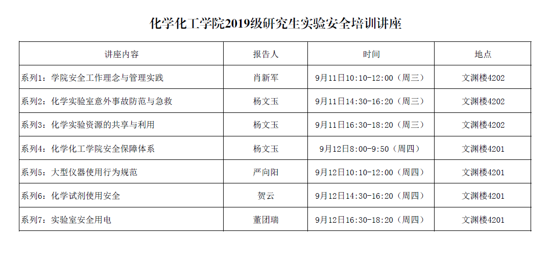 1、实验室安全培训课程为研究生必修课程,要求全体研究生必须参加;如确因特殊情况无法参加本次培训,请于9月9日下午5:00前将请假信息发送至[email protected],请假信息包含学号、姓名、专业、请假原因、需请假的讲座序号,学院将统一安排补课。