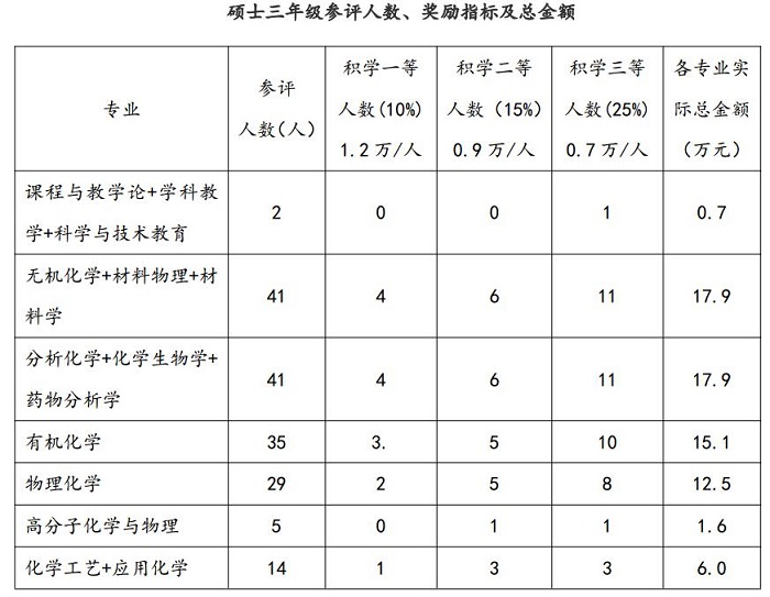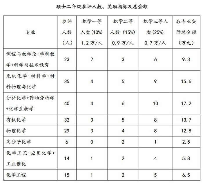 2. 二、三年级研究生积学奖学金由各学科按照评奖原则及本专业特点进行推荐,分专业具体指标如下: