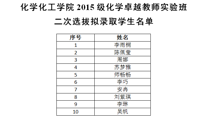 按照《蘑菇视频 卓越教师实验班中期考核、二次选拔实施办法》、《蘑菇视频 2015级卓越教师实验班中期考核、二次选拔考核方案》,经学院二次选拔考核,拟录取学生名单如下: