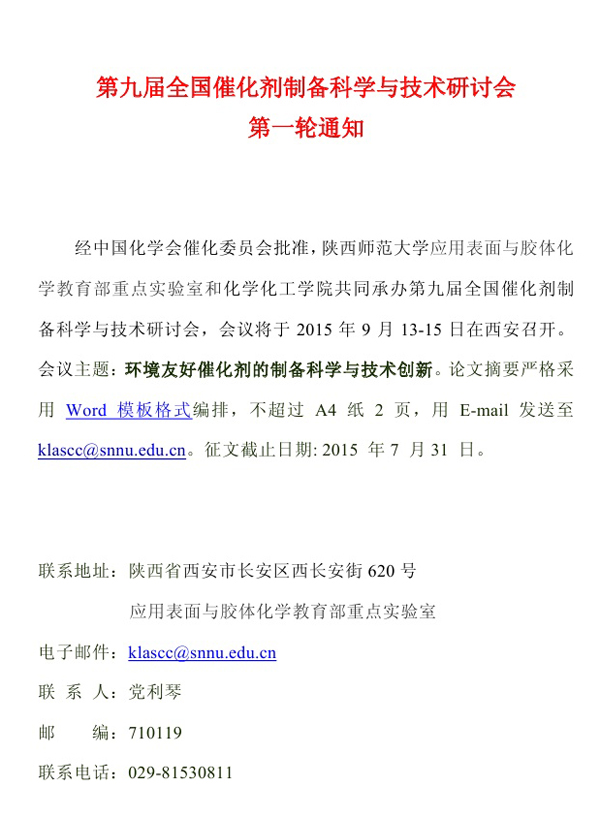 附:第九届全国催化剂制备科学与技术研讨会论文摘要Word模板格式