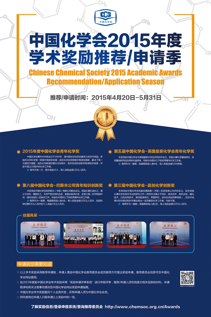 中国化学会2015年度学术奖励推荐申请季已经开始,本季内共有中国化学会青年化学奖(35岁以下)、中国化学会-英国皇家化学会青年化学奖(40岁以下)、中国化学会-巴斯夫青年知识创新奖(45岁以下)、中国化学会-赢创化学创新奖(无年龄限制),四项奖励开放推荐申报。