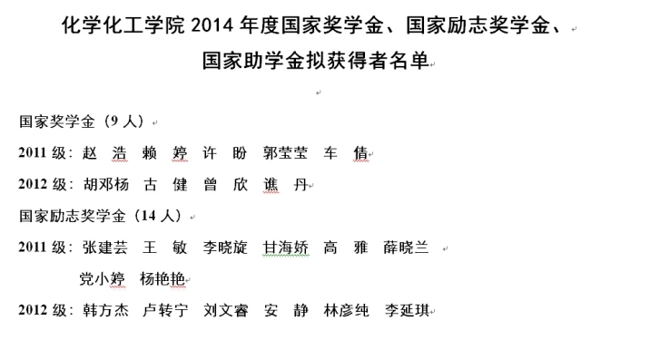 根据国家奖学金、国家励志奖学金、国家助学金的评选办法,结合学生处《关于开展国家奖学金、国家励志奖学金和国家助学金评选工作的通知》精神,经学生本人申请,班级评议,学院评审领导小组审核,现将蘑菇视频 2014年国家奖学金、国家励志奖学金、国家助学金拟获得者名单公示如下。公示期三天,具体时间为2014年10月1日至10月3日。公示期间,若对获奖、获助人员存在异议,请于2014年10月3日下午五点半前通过面谈、电话、短信或邮件方式及时向王启明副书记反映。