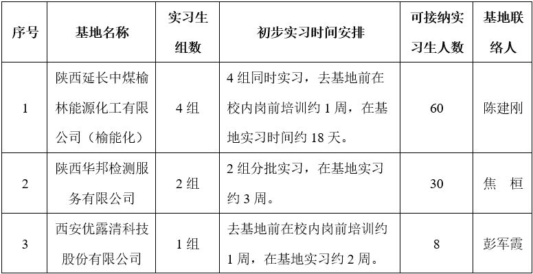 按照学校和学院相关文件规定,学院定于2024年7月中旬至2024年9月底开展2021级非师范专业本科生实习工作,实习单位为:陕西延长中煤榆林能源化工有限公司(榆能化)、陕西华邦检测服务有限公司和西安优露清科技股份有限公司,各基地组织框架和人员分配等见附表1。