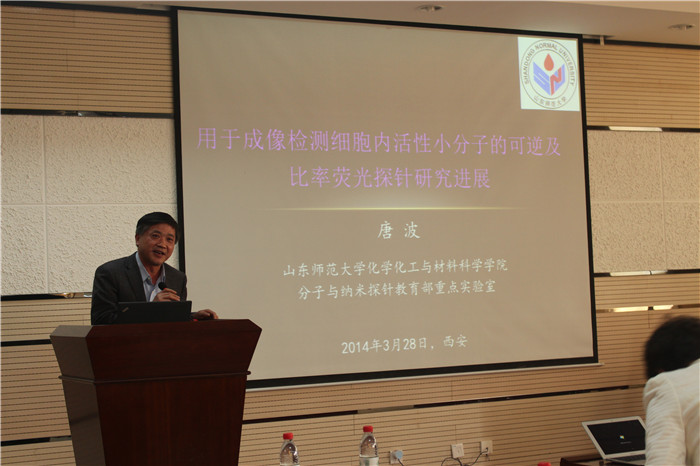 2014年3月28日下午,山东师范大学党委常委、副校长,973首席科学家,国家杰出青年科学基金获得者,“新世纪百千万人才工程”国家级人选,“泰山学者攀登计划”学者,国家自然科学基金委员会第12、13届专家组成员唐波教授,在学院六层报告厅做了题为“用于成像检测细胞内活性小分子的可逆及比率荧光探针研究进展”的学术报告。唐波教授介绍了生物活性小分子的生物学功能及特点,展示了该研究组在荧光成像法、可逆荧光成像和比率荧光成像研究中取得的成果。