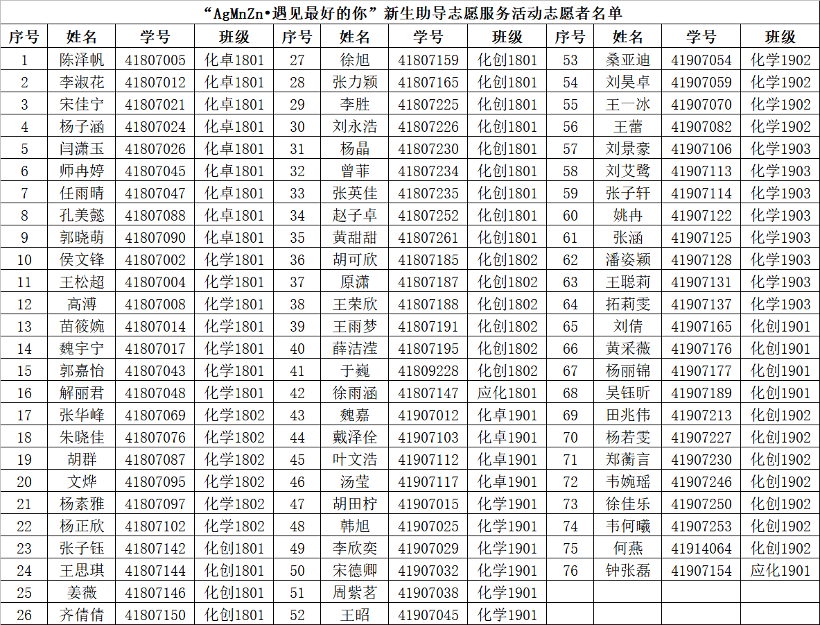 根据《关于公开招募蘑菇视频 “AgMnZn•遇见最好的你”新生助导活动志愿者的通知》要求,按照蘑菇视频 “AgMnZn·遇见最好的你”新生助导活动志愿者招募条件,通过公开招募、自愿报名、择优录取,拟定陈泽帆等76名同学为活动志愿者,现予以公示。