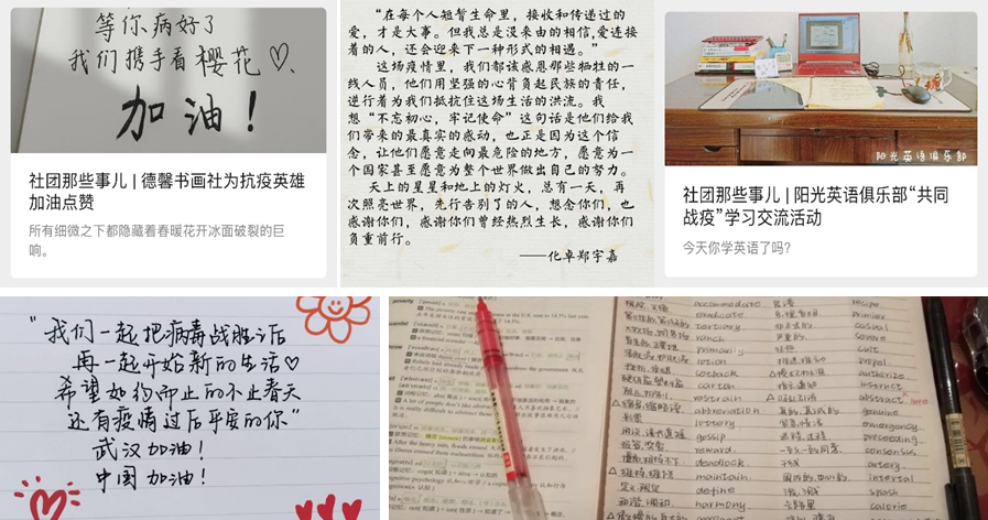 2月6日,学院团委发出了“携手战疫心连心”主题作品征集令,通过手写祝福接力、健康宅生活分享、海报设计、助力视频展示等组织学院团员青年以艺战“疫”,用作品述说感动,为武汉加油,为中国助力。