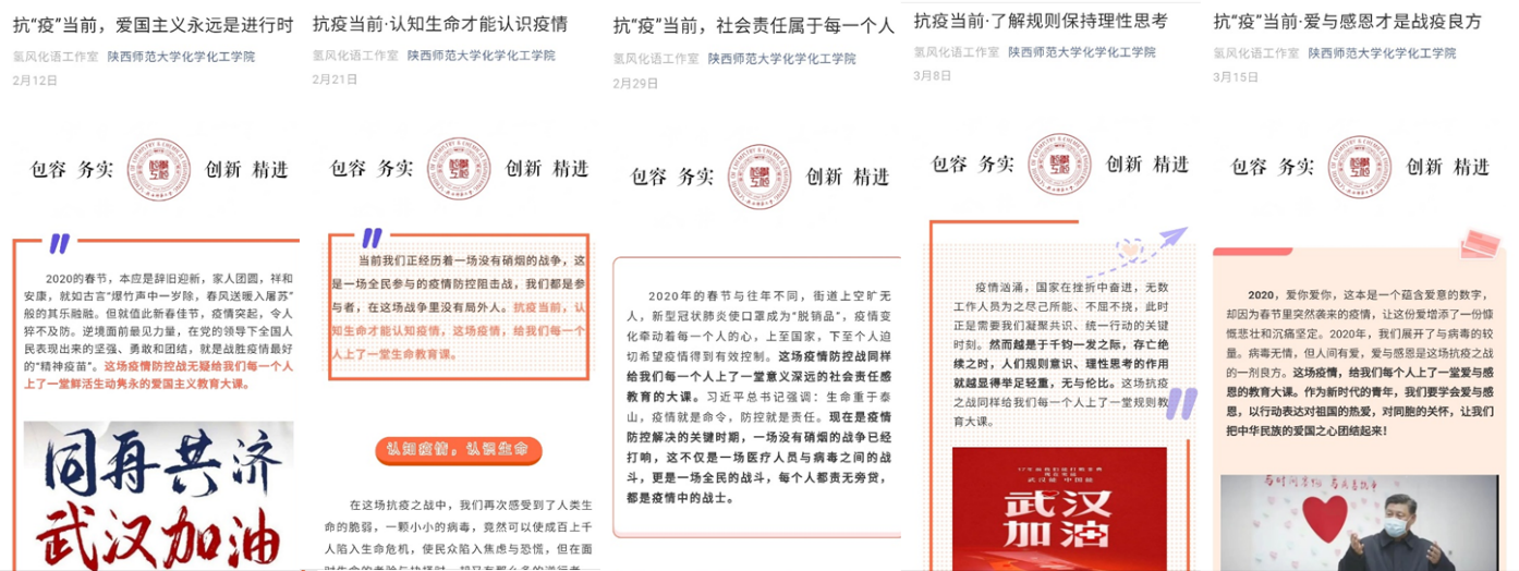 疫情初期,学院团委推出“抗疫当前”系列推文,通过“爱国主义永远是进行时”、“认识生命才能认识疫情”、“社会责任属于每一个人”、“了解规则保持理性思考”、“爱与感恩才是战疫良方”五篇文章,把疫情和灾难变成教材,从正面引导学生以良好的心态,正确认识疫情,抗击疫情,从我做起。疫情期间,指导学院26个本科生团支部积极开展“青春凝聚力量,携手共抗疫情”线上主题团日活动,1128名团员青年通过多种方式,向抗疫一线人员致敬、向积极参与抗疫的青春榜样学习、向克服种种困难“停课不停学”的师生看齐。