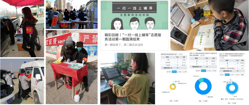 疫情就是命令,防控就是责任。学院青年学生虽不能奔赴前线,但他们也积极参与到了战“疫”专项志愿服务中:通过为医护人员子女提供线上辅导,让一线人员没有后顾之忧;助力社区、村庄的疫情联防联控工作,让社区成为疫情防控的坚强堡垒;同时,学院团委结合实际情况,策划了“一对一线上辅导”,组织更多身在后方的学子用自己的方式参与抗疫志愿服务。“一对一线上辅导”活动覆盖到全院四个年级本科生,使学生在分享中提高综合能力,在获取知识的同时培养奉献精神。
