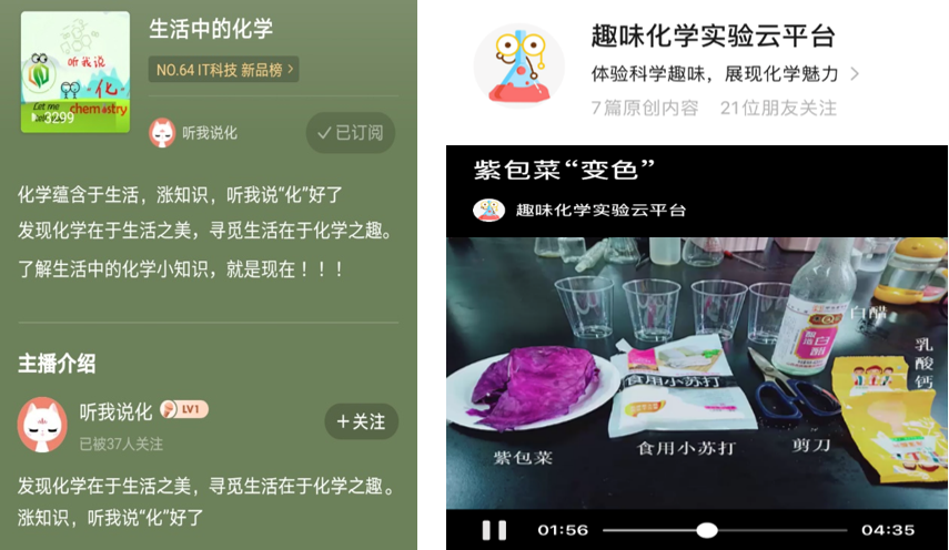 学院团委积极发挥新媒体宣传优势,通过喜马拉雅音频分享平台开设“听我说化”栏目;指导趣味化学实验团队成员将趣味化学实验内容剪辑成系列公开科普视频,建立了趣味化学实验云平台,不间断传播化学正能量。