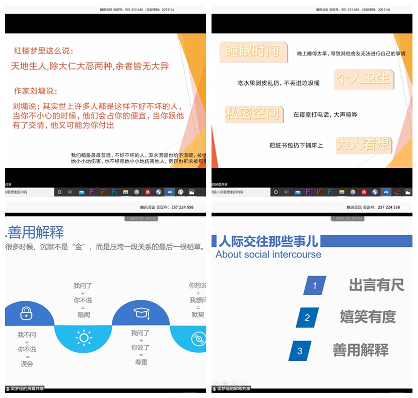 化学1901班开展以“人际交往”为主题的心理云班会,通过发起关于社交性格的趣味测试,以轻松娱乐的方式使同学们了解自我,认识人际交往的意义。同时介绍了“出言有尺”“嬉笑有度”“善用解释”等沟通技巧,引导同学们学会构建良好人际关系,共建良好班风。化学类1902班开通班级树洞,以“宿舍中无法忍受的行为”和“宿舍中的暖心时刻”为题广泛征集班级同学的观点和故事。班会中通过分析总结集体生活中产生矛盾的原因,呼吁同学们主动敞开心扉、积极解决矛盾,共创和谐宿舍。在宿舍风采展示环节,一张张温馨的合照讲述着集体生活的暖心瞬间,疫情虽阻断相见,却阻断不了同学情谊。