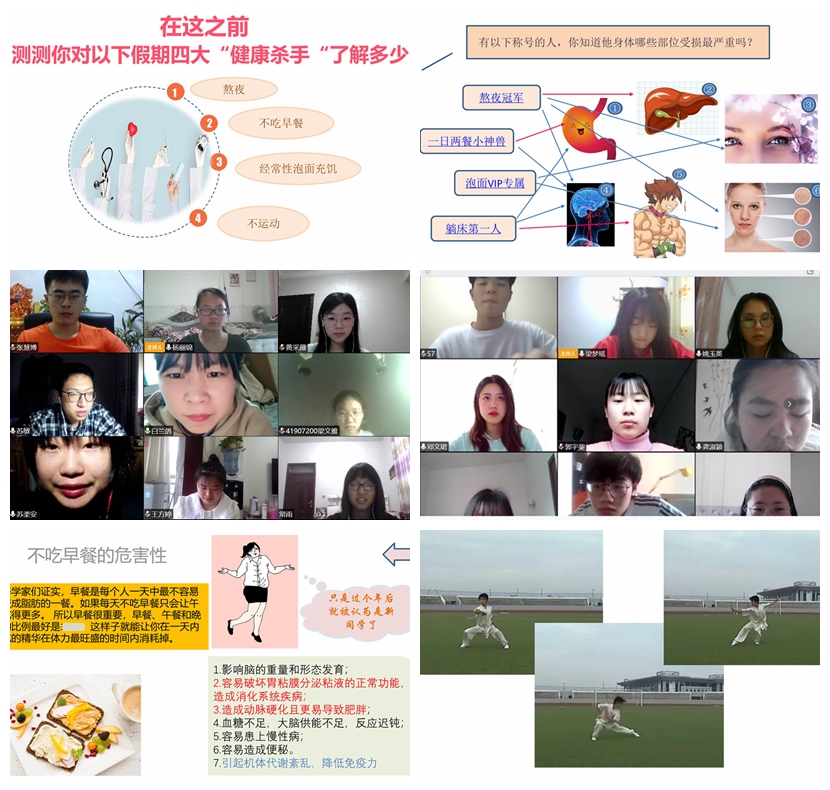 化学类1901班以“健康生活,彩绘人生”为主题开展云班会,通过图文解说的方式列举常见的不良生活习惯、宣讲科学防疫知识,通过视频放映的方式向同学们科普“病毒与人体抗争的过程”,倡导同学们加强体育锻炼,做到健康宅家。“除了生死,其他都是小事儿,除了健康,一切都是浮云……”钟南山院士的抗疫感言引发热议,同学们纷纷表示要敬畏生命、守护健康,积极践行“每个人都是自己健康第一责任人”的理念。