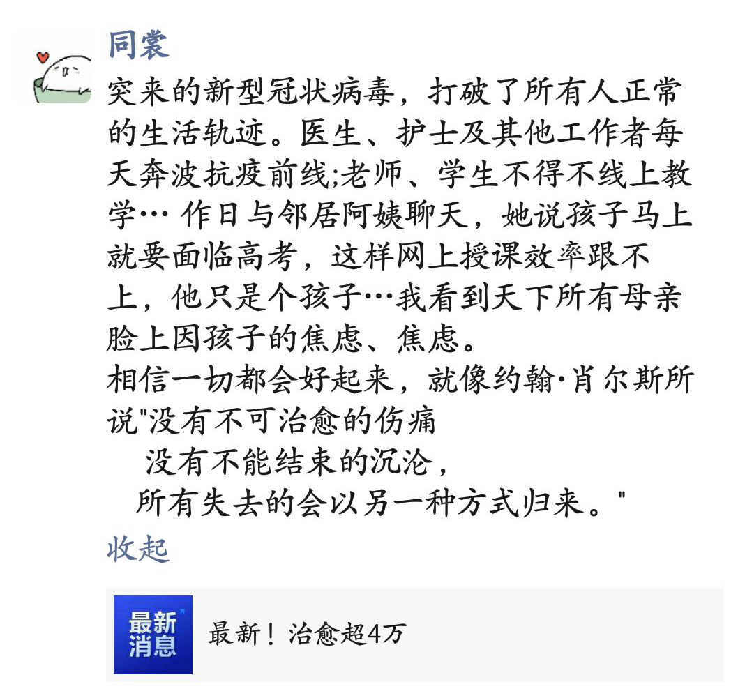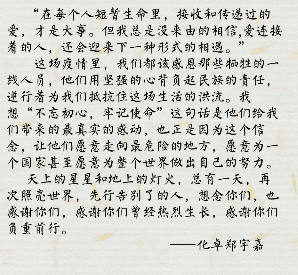 作为一个普普通通的人国难之下好像觉得自己真的什么都做不了只能在以命相博奋战在疫情第一线的人的庇护之下默默祈祷疫情能早日得到控制,但是作为一个亲历者,不管是四年后十四年后四十年后我们应该都会记得这一天,铭记这个春节,铭记无数逆行英雄无畏奔向武汉,铭记他们的姓名与壮举,这些人才是国家的脊梁,才是真的值得我们去应援的偶像。今朝有人为我们遮风挡雨,愿明日我们也能独当一面为他人披荆斩棘,这是承诺,也是责任。多难兴邦,我们坚信中国定能早日战胜疫情走出阴霾!待到春暖花开时,我们再走上街头欢庆,为祖国,更为那些护国佑民的平民英雄!