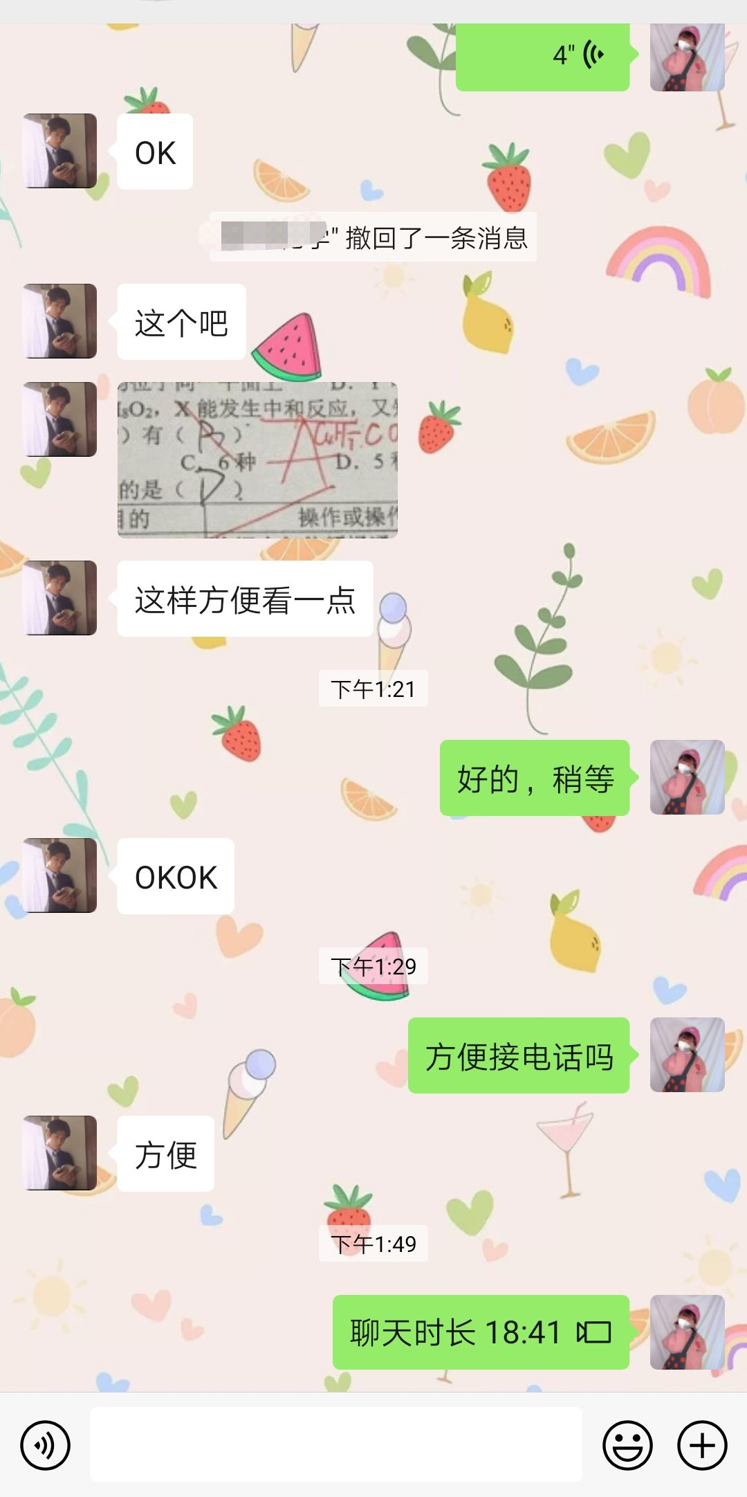 在假期里,李艳琳参加了校团委组织的帮扶医护人员志愿服务活动,帮扶的对象是重庆市公安局防疫人员的孩子。学生是一名高三艺体生,文化课基础不扎实,复习进度比较落后。她针对化学科目,帮学生进行基础知识的梳理和巩固,解决复习过程中遇到的难题。在备课时注重难点和易错点,也会讲解一些解题的小技巧。希望能给予帮扶学生最大的帮助。