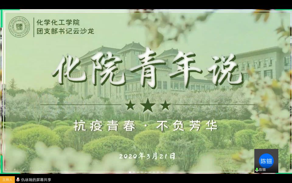 团委通过腾讯会议在线开展了题为“抗疫青春,不负芳华——化院青年说”的团支部书记沙龙。会议由团委书记陈钿主持。学院29名本科生团干部参加了此次会议。