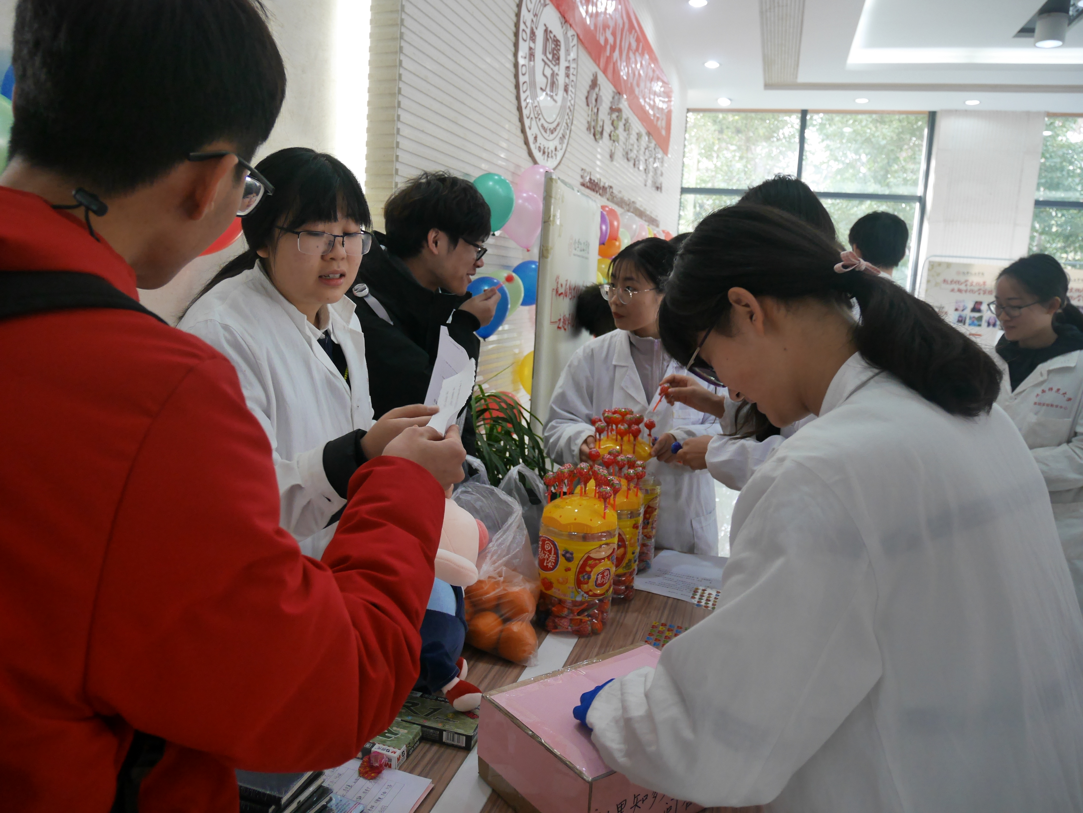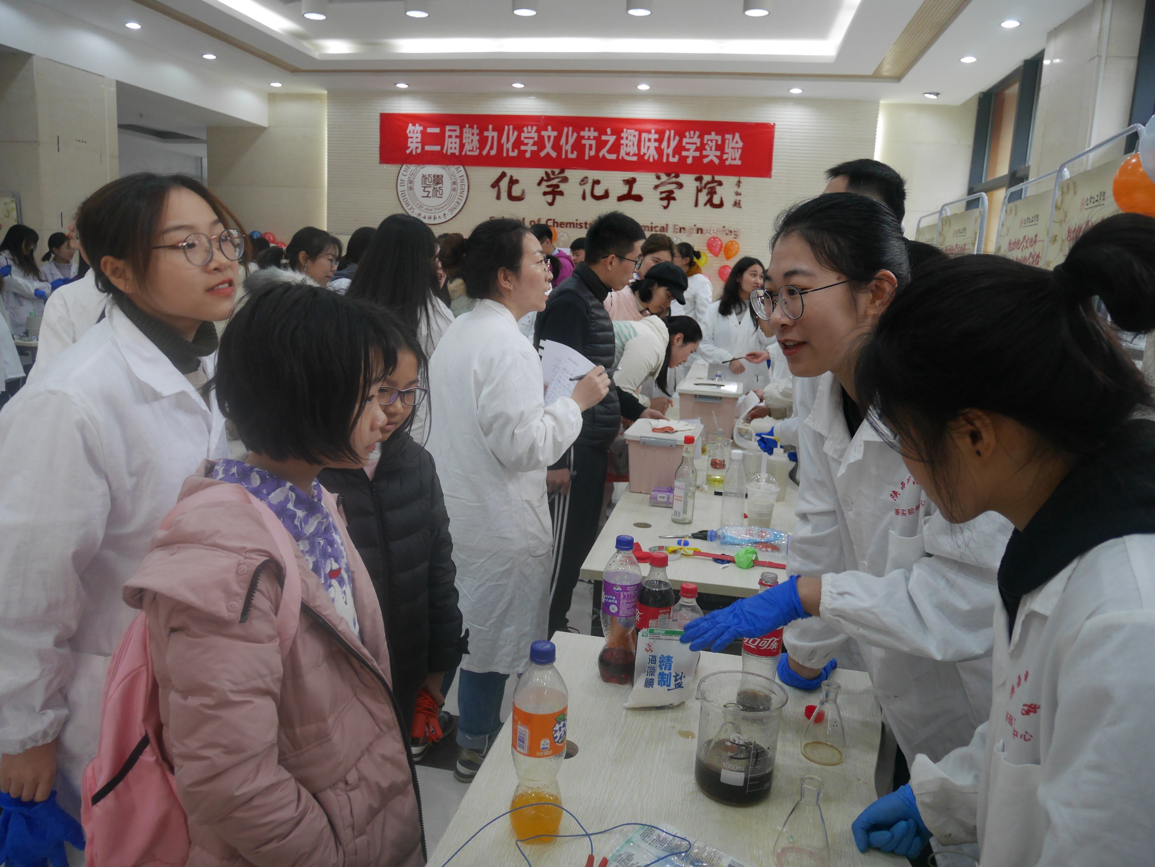 活动开始后,各个团队“各显神通”,尤其是汽水灯笼团队,操作简单,造型别致,寓意深远,以其独特的趣味性和精彩讲述深受评委和观众的喜爱。其他团队也不堪示弱,烧不坏的防火布在酒精灯上自在跳跃,五彩缤纷的彩虹糖展现着色彩的魔力,俏皮的小冰鱼被牵引着上钩,模拟溶洞带人走进一个奇幻的溶洞世界,红绿灯的色彩变换让人啧啧称奇......活动吸引了许多观众驻足,并收到了大量好评。此外,互动答题抽奖区也十分热闹,观众们参与度极高,在提升化学常识的过程中,还获得了精美的礼品。