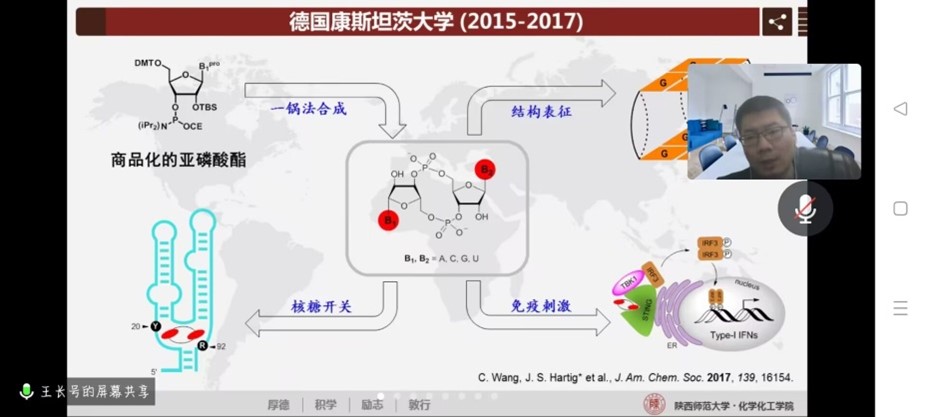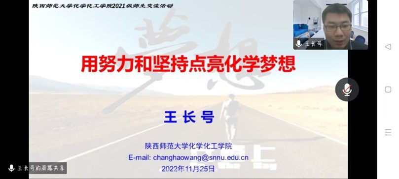 习近平总书记说过:“时代总是把历史责任赋予青年。”新时代的中国青年,生逢其时、重任在肩,施展才干的舞台无比广阔,实现梦想的前景无比光明。为鼓励同学们把握当下,不负韶华,奋斗其时,11月25日,2021级化学卓越班、笃学班邀请2022年国家优青基金项目获得者王长号教授作线上专题报告。2021级卓越班项目主任陈亚芍教授,班主任张学鹏副教授,2021级化学卓越班、笃学班全体同学参加活动。本次报告由张学鹏老师主持。