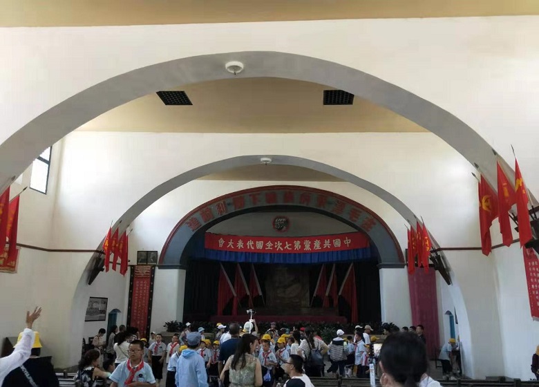 杨家岭革命旧址中央大礼堂主席台的正上方,条幅上赫然写着这12个字,依稀可见当年中共第七次全国代表大会的盛况。74年前,在这里确定了党的政治路线,确立毛泽东思想为党的指导思想并写入党章。走进中央大礼堂,里面的陈设仍然保持着74年前的风貌。七大作为“团结的大会、胜利的大会”必将载入史册,杨家岭这个陕北的小村庄也将被历史铭记。