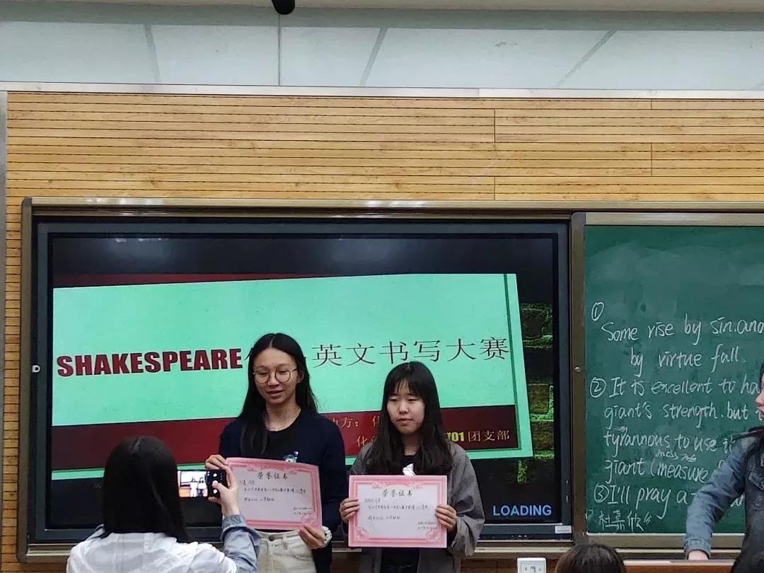 此活动由化学创新实验班1701、应用化学1701两个班联合承办,以英语书写技能为载体来提升同学们的英语学习兴趣。活动的第一部分是粉笔字书写比赛,第二部分是硬笔书法书写比赛,在紧张的比赛过后,班委们为表现优秀的同学颁奖。