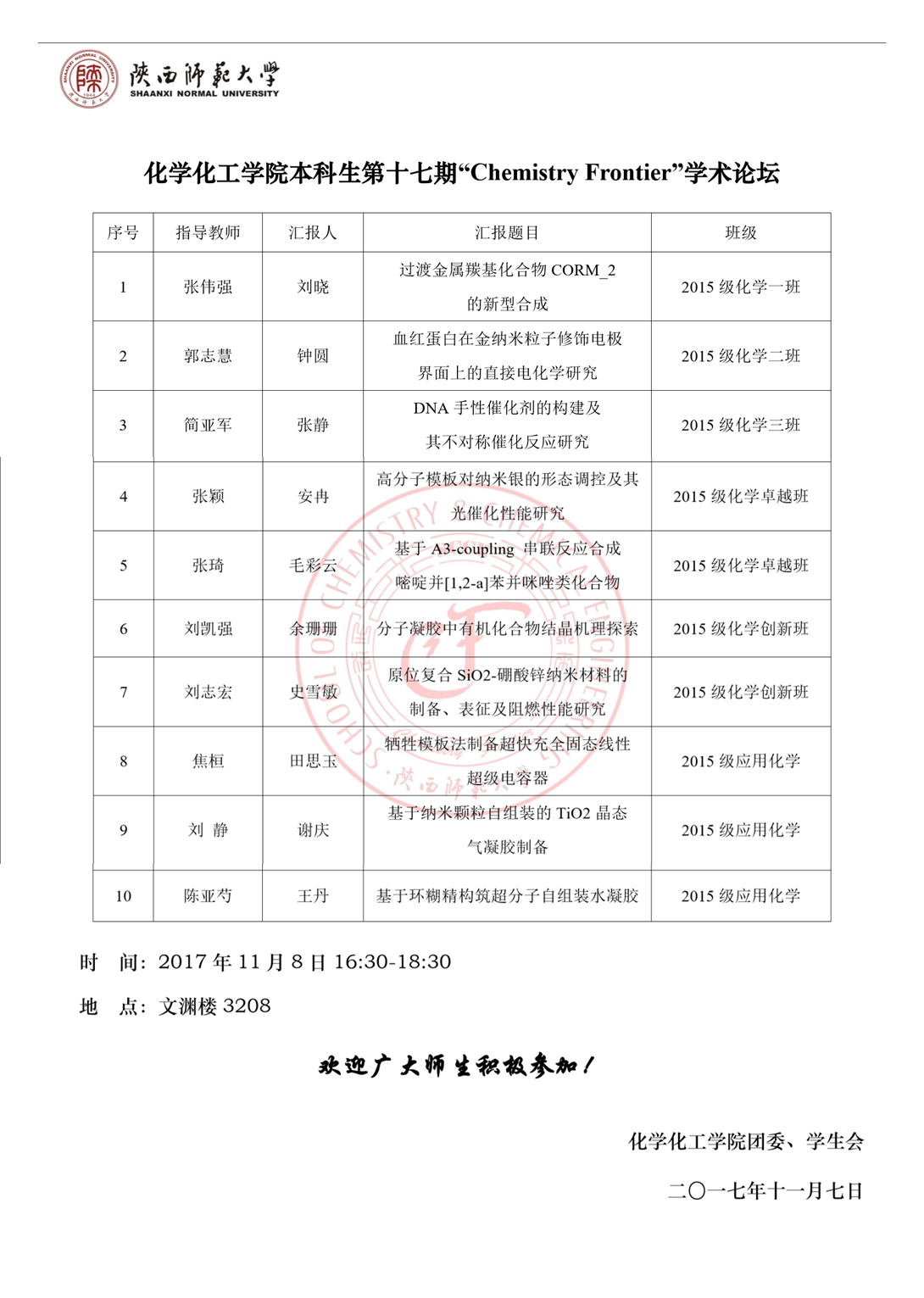 【通知】蘑菇视频 第十七期本科生“Chemistry Frontier”学术论坛