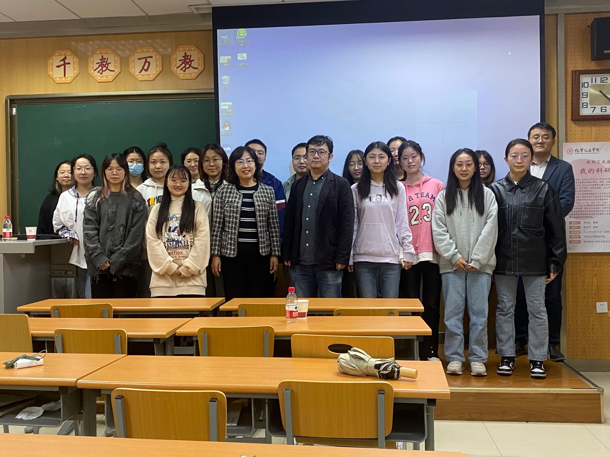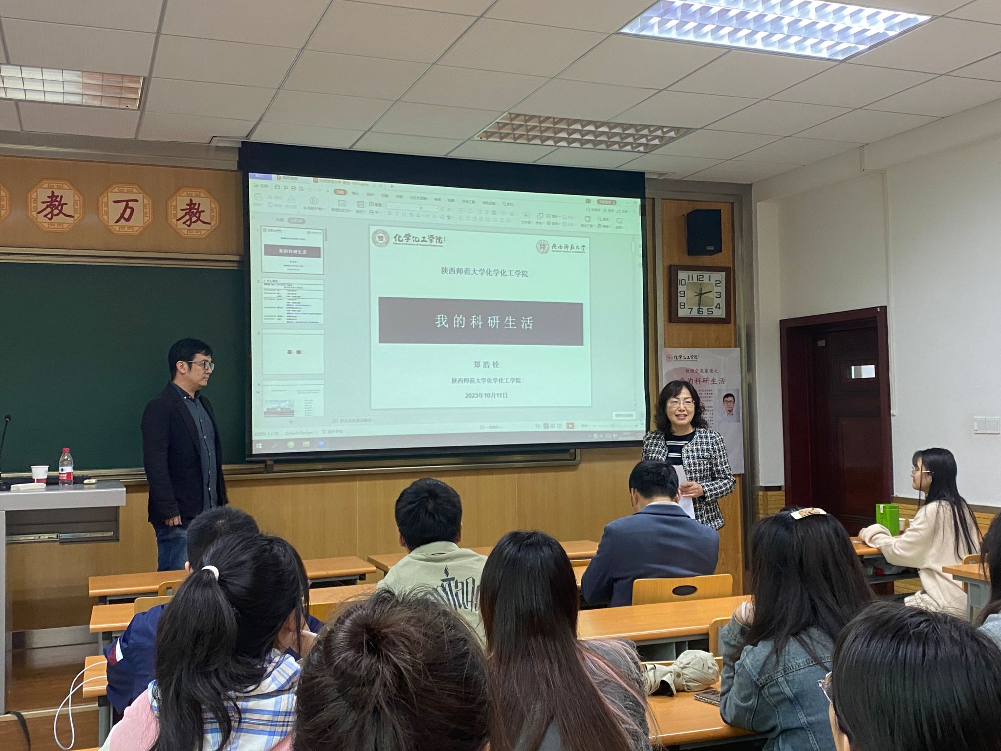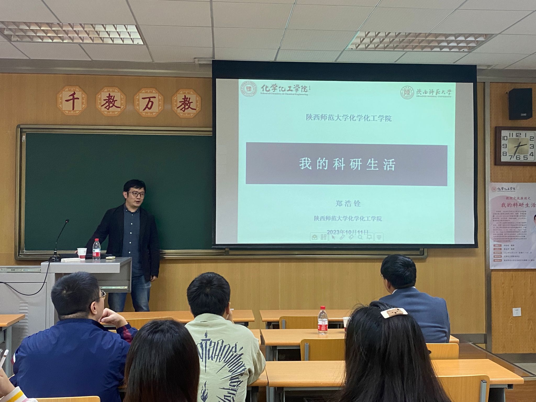 2023年10月11日下午,郑浩铨教授受2021级化学卓越教师实验班邀请,于长安校区文渊1312教室围绕科研学习作经验分享讲座。本次活动由2021级卓越班项目主任陈亚芍教授和班主任张学鹏副教授主持。