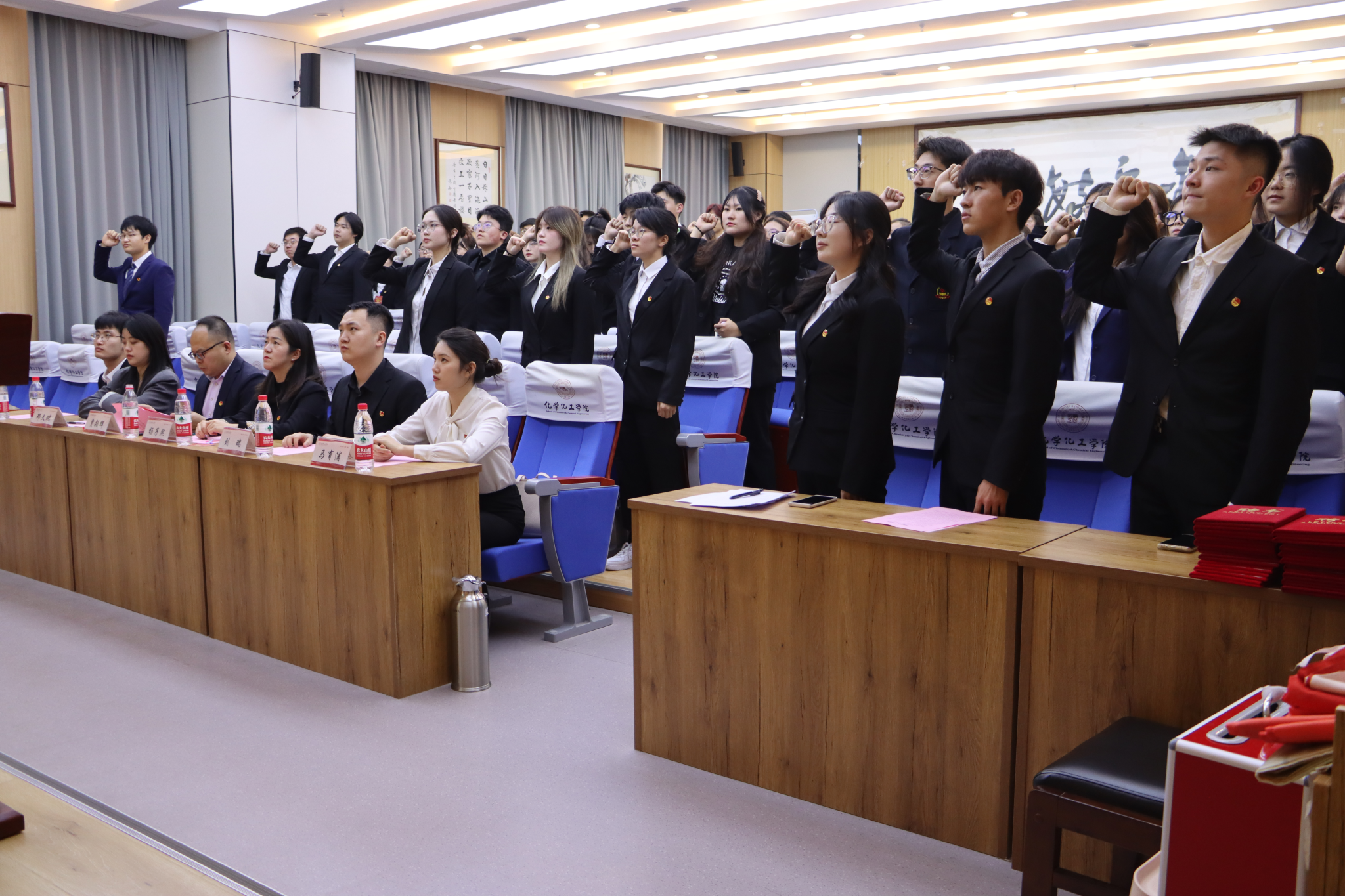 朝阳理论学习社社长米雪带领新聘任的学生组织工作人员宣誓。老师们为各学生组织负责人颁发聘书,为各学生组织和学院直属社团授旗。