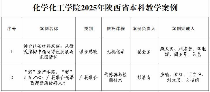 翟全国教授团队依托《无机化学》课程,申报“神奇的碳材料家族:从微观结构中谱写绿色发展与家国情怀”课程思政案例。该案例以教育部发布的《高等学校课程思政建设指导纲要》为指导,深入挖掘、凝练课程中的思政元素和案例,培养学生的创新思维、责任担当、家国情怀、奉献精神,引导学生树立正确的世界观、人生观、价值观,构建全员全程全方位育人大格局。彭浩南教授团队依托《传感器与检测技术》课程,申报“‘感’通产学路,‘智’汇育才心:产教融合托举西部新质传感人才”产教融合案例。该案例将企业生产过程中的新方法、新技术、新工艺、新标准引入教学,转化为教学资源,更新课程内容,促进案例式教学的开展实施,有效提高学生的工程能力、职业素养和就业创业能力,实现教育与产业同频共振、共赢发展。