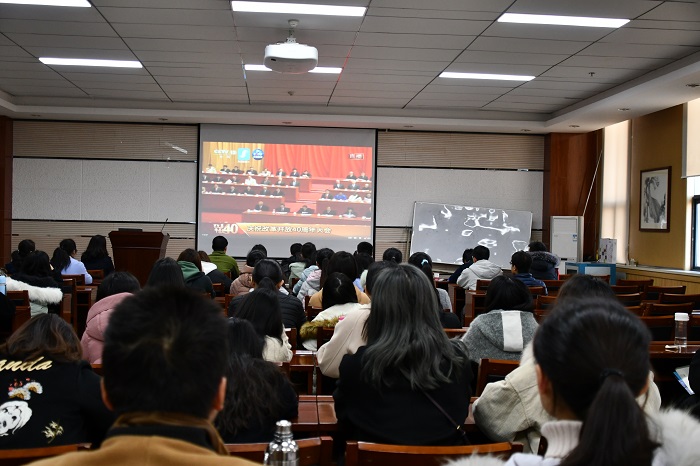 首先,大家一同观看了大会实况,习近平总书记指出,改革开放近40年,到2018年我们要隆重地纪念一下,2018年就是40年,在中国共产党领导下,中国人民凭着一股逢山开路、遇水架桥的闯劲,凭着一股滴水穿石的韧劲,成功走出一条中国特色社会主义道路。我们遇到过困难,我们遇到过挑战,但我们不懈奋斗、与时俱进,用勤劳、勇敢、智慧书写着当代中国发展进步的故事。