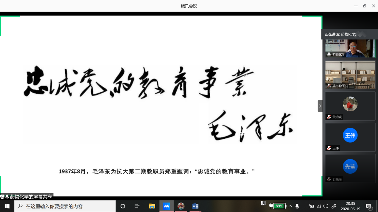 6月17日晚,教工分析化学党支部15名党员(1名党员网络拥堵)齐聚云端,采用腾讯会议,开展了一次别开生面的支部组织生活学习活动。此次学习的主题是“深化教师师德师风建设,恪守“新时代高校教师职业行为十项准则”,努力成为‘四有’好老师”。