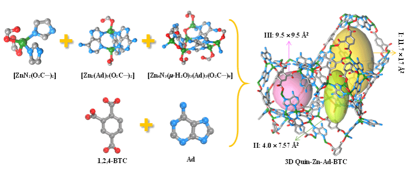 图2. 五组分MOF Quin-Zn-Ad-BTC的结构组装示意图。