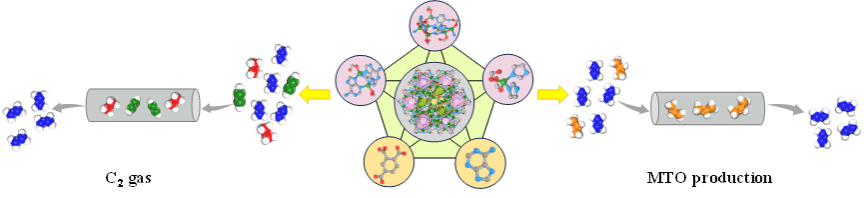 作为石油化工行业的基础原料,乙烯(C2H4)在合成多种高附加值有机化合物和聚合物过程中具有关键作用。工业上主要通过石油裂解工艺生产C2H4,该过程不可避免地会产生大量副产物(包括乙烷C2H6和乙炔C2H2)。这些气体的共存为乙烯提纯带来重大挑战——工业应用要求超高纯度C2H4,必须同时高效去除C2混合物中的C2H6和C2H2。因此,从C2混合气中一步纯化乙烯成为至关重要的工业流程。工业上常用低温高压精镏的分离方法进行纯化C2H4。然而这却是一个十分耗能的过程。MOF作为一种新兴的晶态多孔材料,被认为是理想的乙烯分离的材料。然而,设计结构新颖,性能优异的MOF材料,仍面临很大的挑战性。