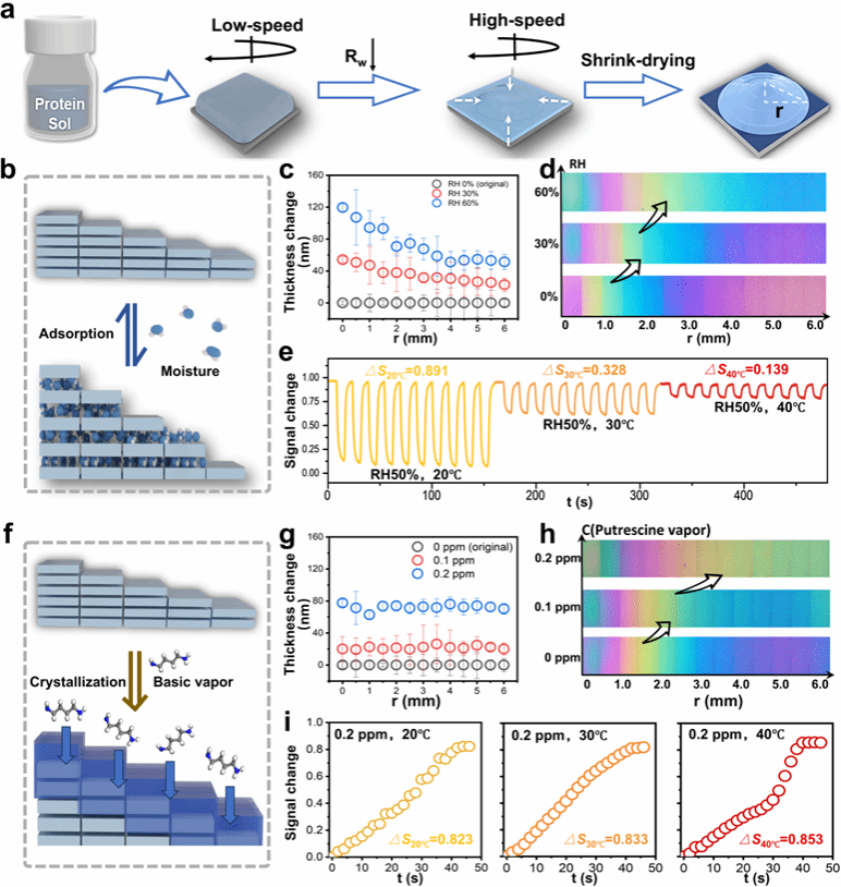 该工作受晶体X射线衍射现象(布拉格镜)的启发,提出了一种梯度表面比色传感器(GSCS),通过厚度梯度薄膜将3D结构变化转化为2D干涉图案。与以往追求厚度均匀性的研究不同,本研究利用薄膜厚度差异性,通过两步旋涂法在硅基底上制备具有理想厚度梯度的蛋白质纳米晶体薄膜。当传感器与刺激物蒸气作用时,厚度增加表现为干涉图案从中心向外扩展。进一步,这种像素级图案响应可定量转化为一维色差积分光谱(CDIS)的位移。CDIS能够抵抗环境光照和颜色漂移的干扰,其基于像素的模式识别比简单颜色识别更灵敏、更准确。实验证明,蛋白质纳米晶体衍生的GSCS平台在检测水分和生物胺蒸气时表现出高性能传感能力,尤其是使用普通工业CCD相机(510×510像素)时,CDIS实现了亚0.5 Å的空间分辨率,其灵敏度比专业光谱仪获取的反射光谱高2.6至5倍。这一成果为高性能比色传感器的开发提供了一种经济高效且通用的新工具。