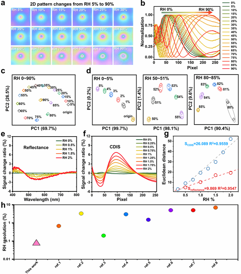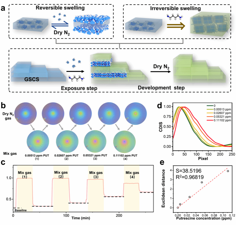 分别通过吸附膨胀和结晶膨胀机制用于湿度及腐胺蒸气检测。通过“曝光-显影”策略,我们成功实现了高湿度环境下海鲜腐败的实时监测。与专业光谱仪的反射率测量相比,布拉格图案分析在两种检测模式中均展现出2.6-5倍的灵敏度提升。这项工作为开发高性能、低成本比色传感器提供了新思路,其功能可媲美甚至超越笨重昂贵的现代光学传感器。