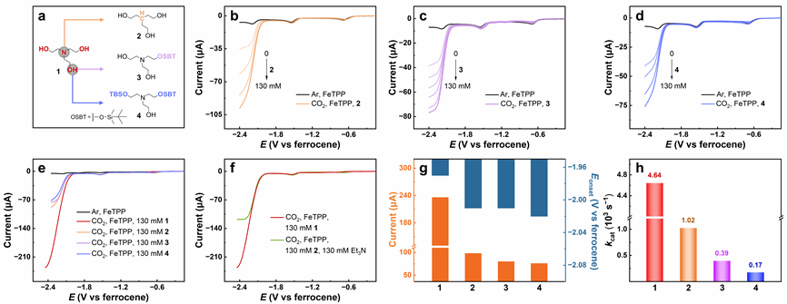 接着,为了确定1结构中独特的三脚架结构在捕获CO2分子方面的关键作用。设计并合成了与1结构相似的化合物2、3和4。在0.5 mM催化剂FeTPP的DMF溶液中加入2、3和4之后,均在Fe0处出现了明显的催化电流。通过比较可知,1加入之后有更早的催化起峰电位(−1.97 V),最大的催化电流(239 μA)和最大的催化速率常数(4.64 ×103 s−1)。