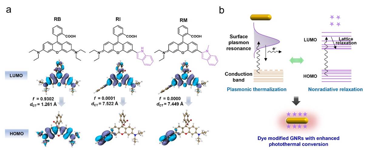 为理解修饰GNRs优异的光热转换性能,我们利用密度泛函理论计算了所设计分子的激发态构象及前线轨道。结果表明,所设计分子中涉及较强的分子内电荷转移,且具有极低的辐射跃迁概率。因而,我们推断,修饰GNRs的优异光热性能得益于等离子体热效应和非辐射弛豫的协同作用。