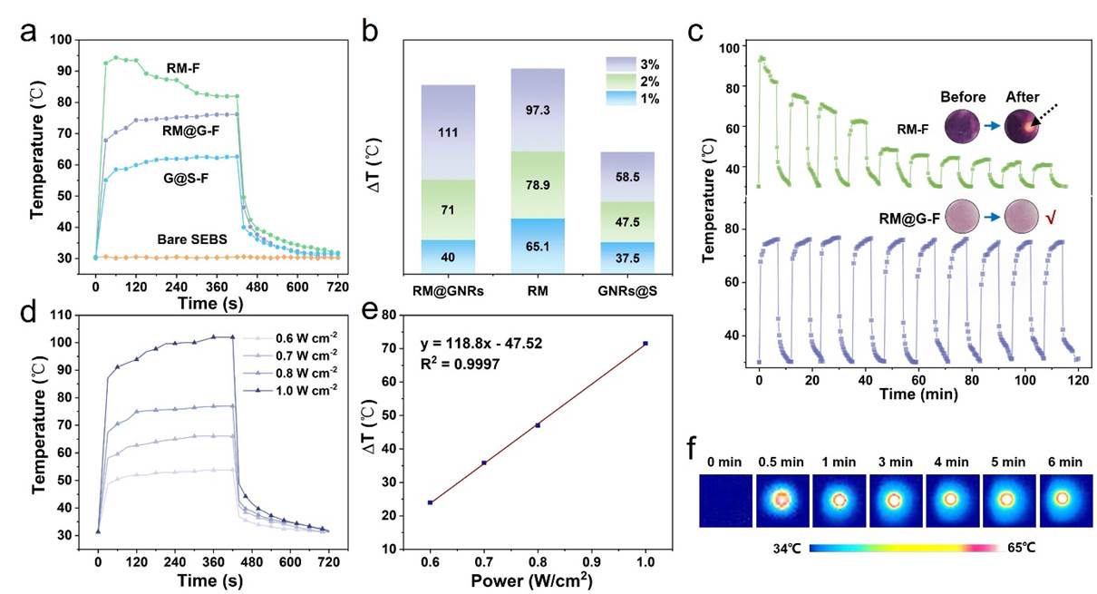 在638 nm激光照射下,修饰后的GNRs掺杂的薄膜表面温度升高可高达111°C,是相同条件下未修饰GNRs掺杂薄膜的两倍。通过调节掺杂材料浓度或光功率,可以将薄膜的表面温度精确控制在31至116°C之间。此外,研究发现,仅掺杂有机分子的薄膜在光照一次之后就发生了明显的光漂白作用,而修饰后的GNRs掺杂的薄膜具有更优异的稳定性和可重复使用性,在循环使用10次之后依然保持很好的光热转换性能。