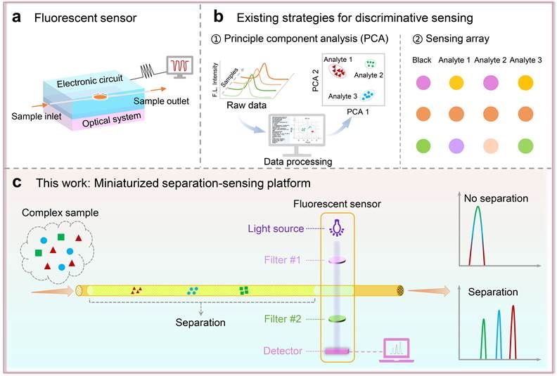 图1. a) 荧光传感器; b) 现有的区分传感策略; c) 微型化的分离传感平台。