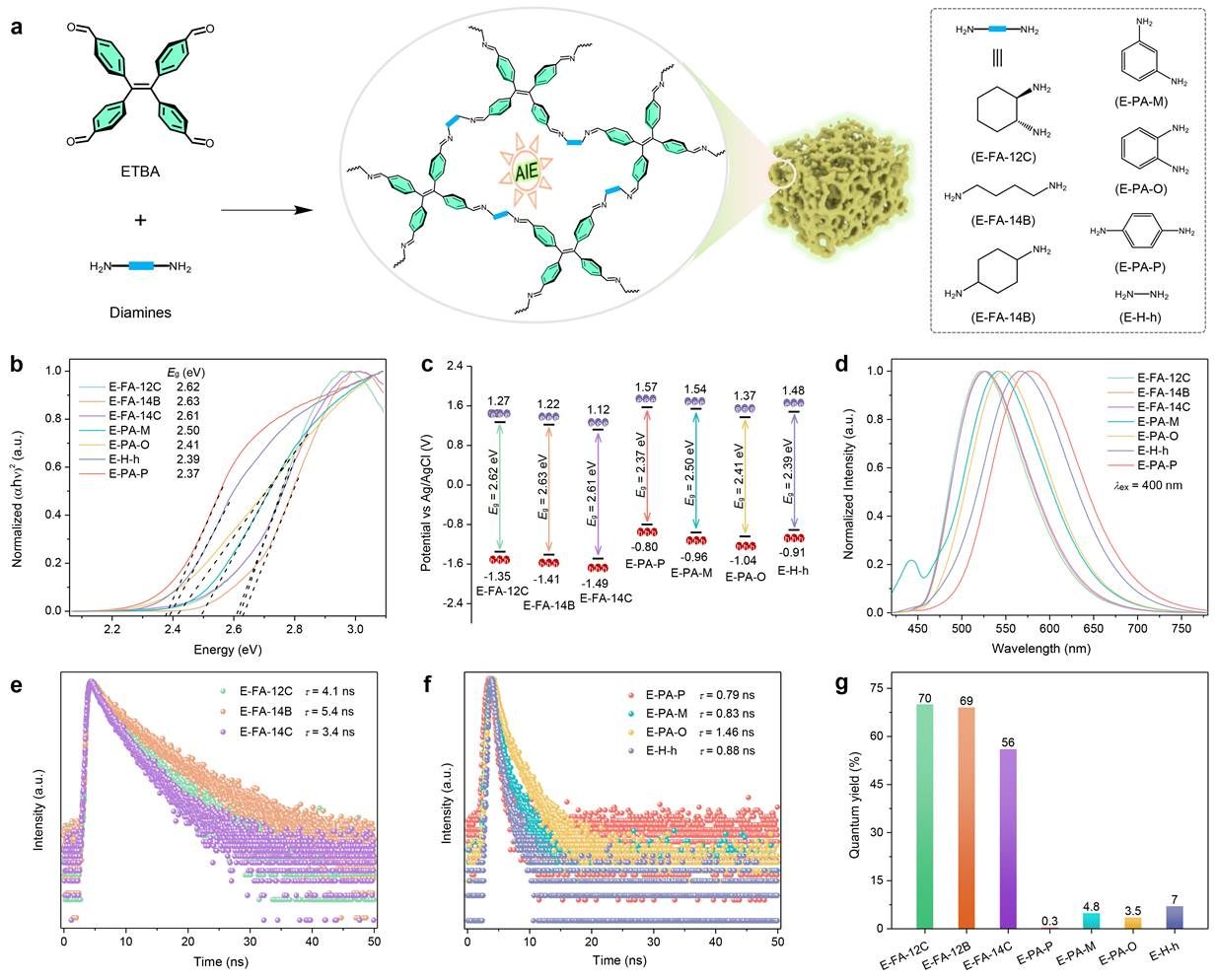 图2. 荧光整体材料的合成和光物理性质。a) 化学结构; b) Tauc曲线; c) 价带和导带分布图; d) 荧光发射光谱; e-f) 荧光寿命; g) 量子产率。