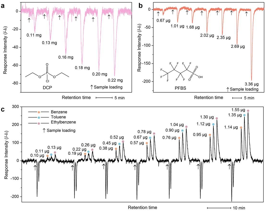 基于此,作者自主搭建了分离传感一体化平台(图3d),其中荧光整体柱既作为分离介质,又作为传感介质,利用荧光整体材料的分离和传感能力,建立了一个死体积可忽略的微型分离传感一体化平台。 基于荧光整体柱良好的荧光性能和传质能力,作者在搭建的分离传感平台上实现了甲醇中微量水、沙林模拟剂、全氟烷基化合物和金属离子的定量分析。分离传感平台还实现了苯、甲苯、乙苯和二甲苯的分离检测,检测限低至86、54、19和58 ng。