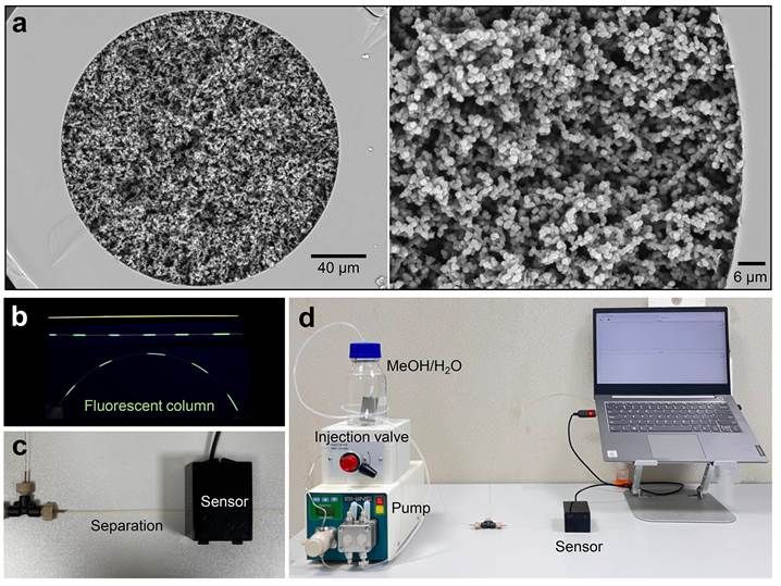 图3. E-FA-12C荧光柱的a) 扫描电镜图像; b) 日光和紫外光下荧光整体柱的照片; c) 具有分离和传感能力的整体柱; d) 自制的分离传感平台。