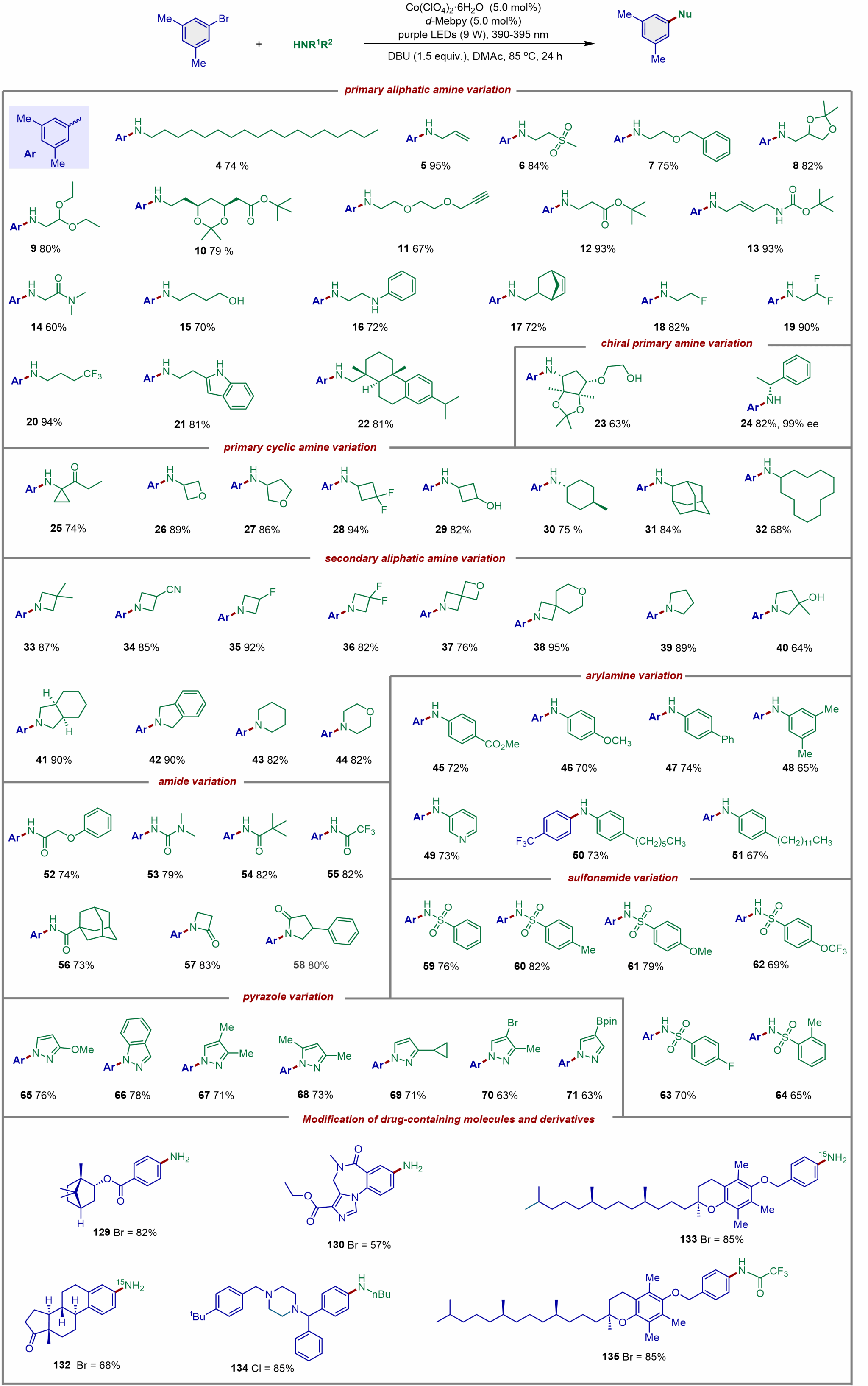 薛东课题组基于前期的研究基础 (Angew. Chem. Int. Ed. 2021, 60, 5230; Angew. Chem. Int. Ed. 2021, 60, 21536; ACS Catal. 2022, 12, 15590; ACS Catal. 2024, 14, 4968; Angew. Chem. Int. Ed. 2024, 63, e202314355),发展了基于钴催化剂的高效、自适应光化学 C-N 偶联反应新体系。该体系使用相同的钴源和配体,在相同的反应条件下(溶剂、碱和温度),无需外源光敏剂,实现了芳基卤化物与七种不同类型含氮亲核试剂(脂肪胺、芳胺、酰胺、磺酰胺、吡唑、铵盐)的C-N偶联(图1)。该光化学胺化反应中,单一钴催化剂发挥了双重作用:作为光敏剂吸收光和作为催化剂构筑C-N键。反应表现出优异的官能团耐受性,能够兼容挑战性的富电子芳基卤化物和邻位位阻的芳基卤化物,并实现了在药物分子合成中的应用(图2)。这项工作为发展通用性C-N偶联反应催化剂体系提供了新思路。