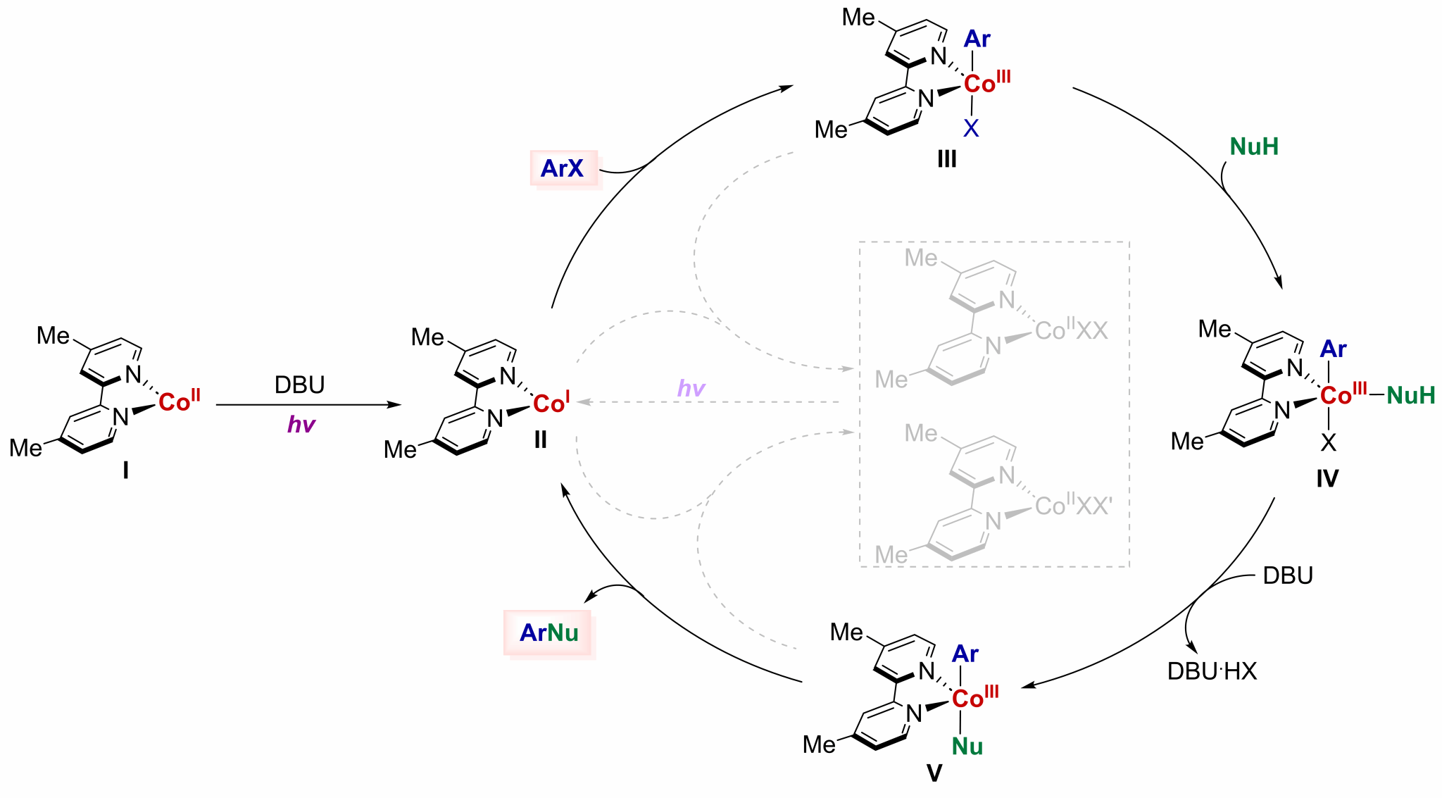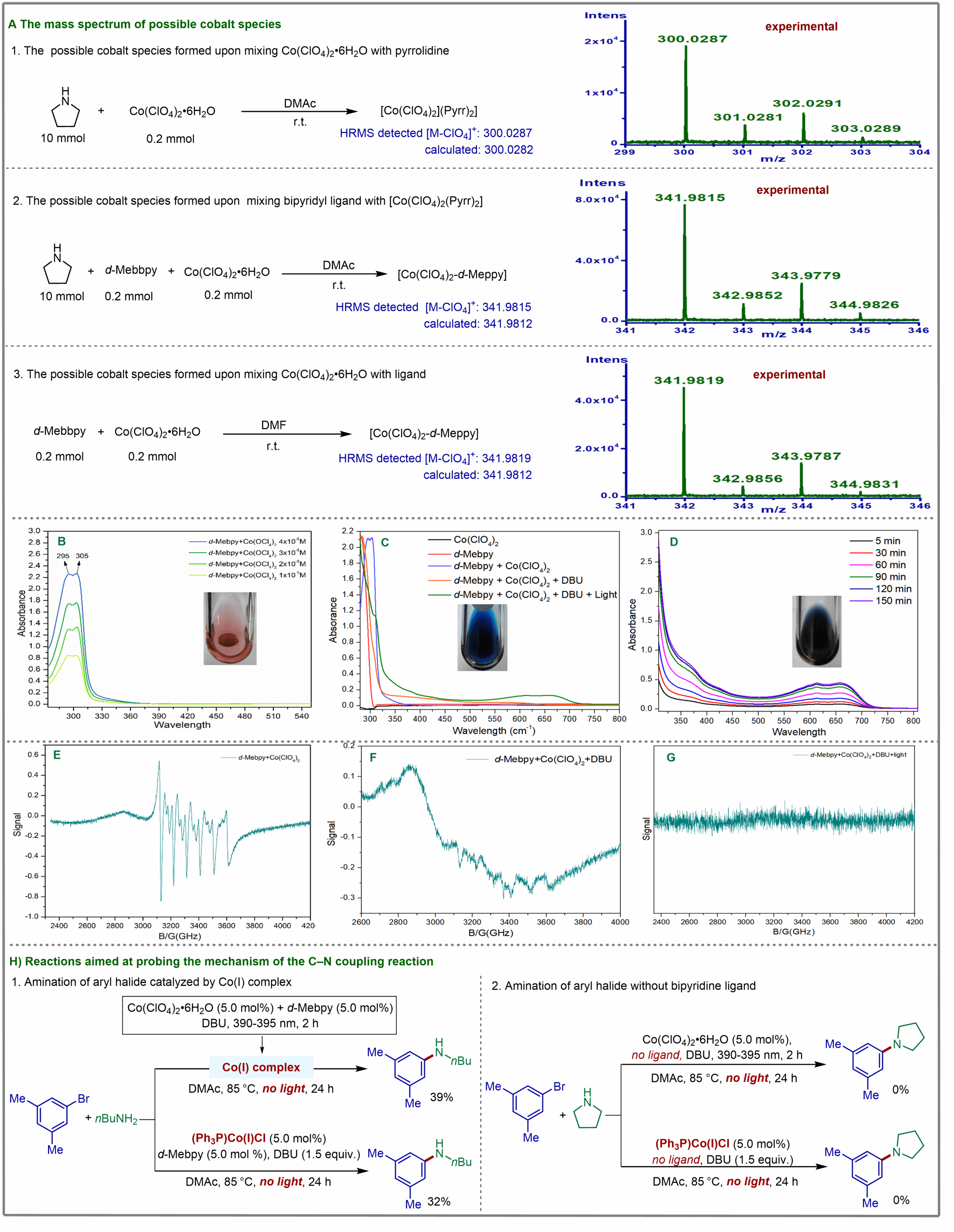 为了理解反应过程,作者利用高分辨质谱(HR-MS)技术对催化剂中间体进行了检测。实验发现,当胺与联吡啶共存时,联吡啶配体在催化过程中与Co(II)离子的配位能力更强,这一发现解释了为什么在没有联吡啶配体的情况下无法发生C-N偶联;进一步通过紫外(UV-vis)和电子顺磁共振(EPR)实验手段,揭示了在光激发下,有机胺作为电子供体可以将Co(II)物种还原产生活性Co (I)物种,同时通过控制实验进一步证实了反应过程中Co(I)物种是启动和维持催化过程的关键活性物种(见图3),这些实验结果表明该C-N偶联反应可能是通过Co(I)/Co(III)的催化循环完成的(见图4)。这项研究不仅拓展了钴催化剂在有机合成中的应用范围,还为解决C−N偶联反应的通用性问题提供了新的路径。