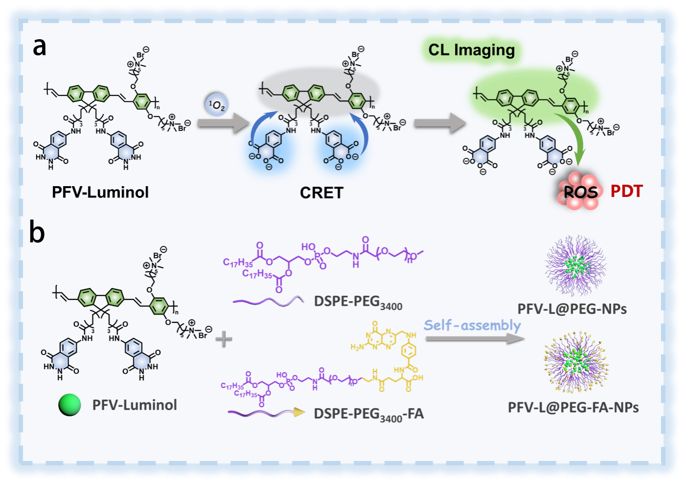 唐艳丽教授课题组长期致力于新型共轭聚合物材料的设计合成及其在生物传感、成像和生物医疗等方面的应用研究,近期在疾病标志物的检测、肿瘤治疗、组织修复、抗微生物等研究方面取得了系列进展(CCS Chem. 2023, DOI: 10.31635/ccschem.023.202303370; Adv. Sci. 2024, 11(3), 2304048; Adv. Funct. Mater. 2023, 33, 2213440; Adv. Healthc. Mater. 2023, 2302818; ACS Appl. Mater. Interfaces 2024, DOI:10.1021/acsami.3c12553; Chem. Commun. 2022, 58, 3957-3960; ACS Appl. Mater. Interfaces, 2022, 14, 15623-15631; Chem. Sci. 2021, 12(34), 11515-11524; Small 2021, 17(52), 2104581.)。在此基础上,利用共轭聚合物具有强的吸光能力、高亮度、高活性氧产率及优异的生物相容性等特点,唐艳丽教授课题组设计并合成了一种基于共轭聚芴乙烯 (PFV) 和异鲁米诺的新型化学发光共轭聚合物PFV-Luminol。值得注意的是,具有化学发光能力的异鲁米诺基团作为能量给体通过酰胺键共价连接在受体PFV侧链,确保了给受体基团间的构成稳定性;并且,由于两者的距离非常近,加上异鲁米诺的发射光谱与PFV的吸收光谱高度重叠,大大提高了二者之间的化学发光能量转移 (CRET) 效率。实验结果表明, PFV-Luminol对于活性氧特别是单线态氧具有非常好的响应效果,作为一种新型的集化学发光试剂与光敏剂于一体的探针,不需要外部光源,即可以在活性氧 (ROS) 过表达的条件下进行化学发光成像和化学发光引发的PDT,为深层组织的炎症成像及肿瘤成像与治疗提供了新的平台。