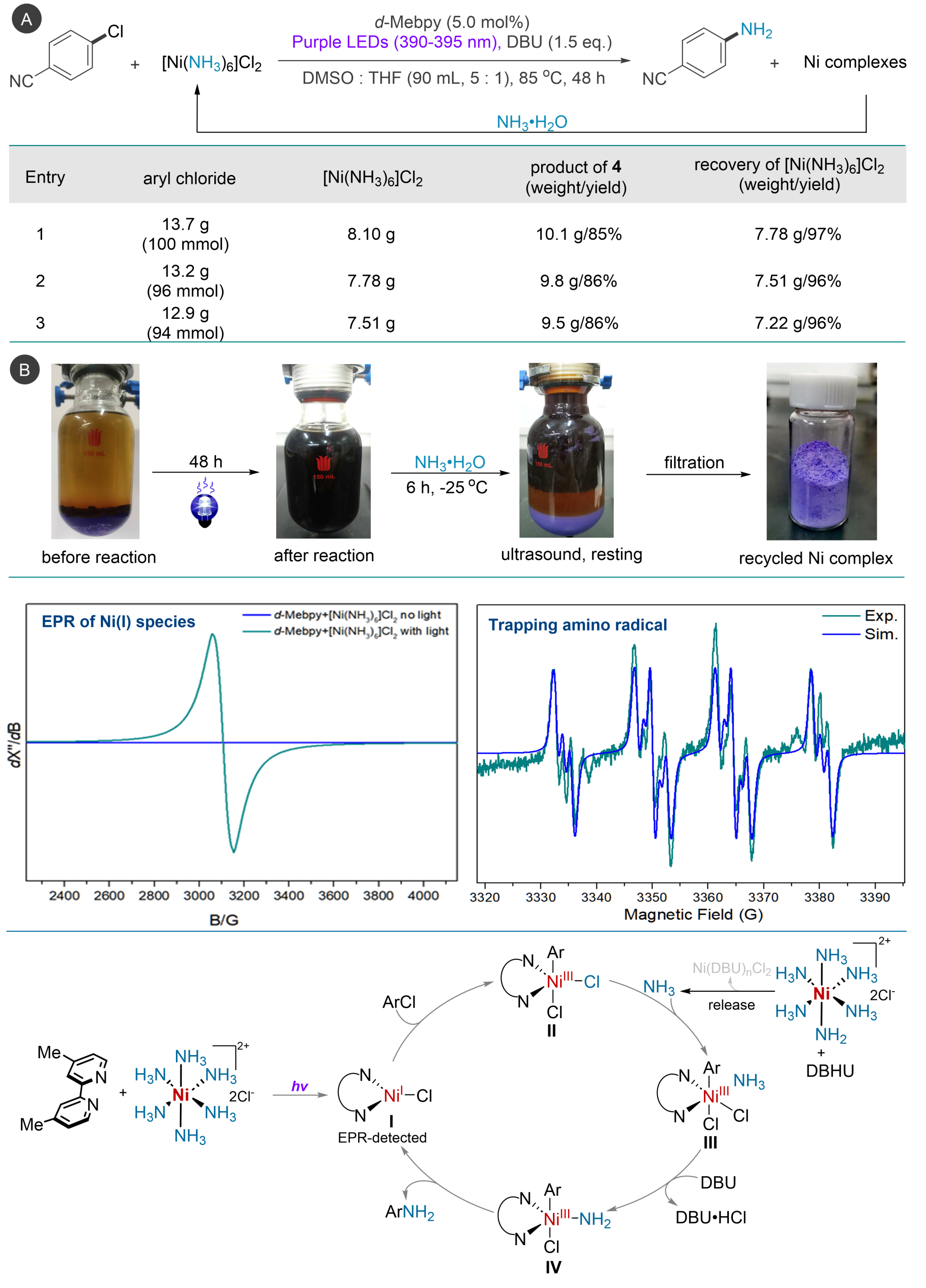 机理研究表明:光照下,联吡啶配体存可以促进Werner盐缓慢释放氨气;光激发下,Werner盐-联吡啶体系可以产生活性Ni(I)活性物种。EPR实验证实了体系中存在Ni(I)物种和氨基自由基的存在,这些结果证明该反应可能经历Ni(I)/Ni(III)过程实现催化循环 (图 3)。