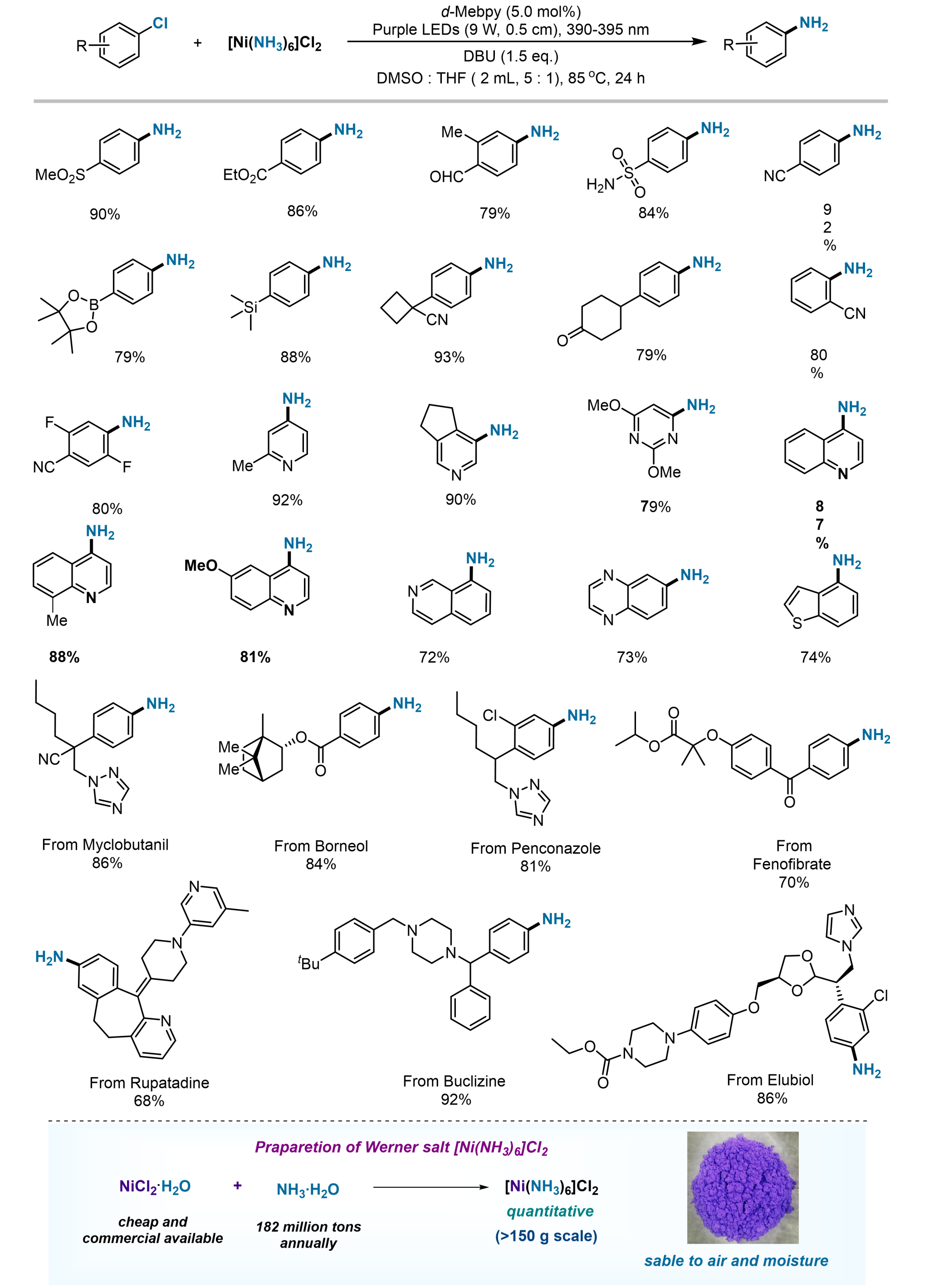 以氨气或氨水为氮源,过渡金属催化卤代芳烃参与的 Buchwald-Hartwig 和 Ullmann-Ma C-N 偶联反应为芳基伯胺的合成提供了重要替代方法。然而,NH3容易与金属催化剂配位形成稳定的金属-氨络合物(Werner盐),导致催化剂失活,限制了这些催化剂体系在芳胺及其衍生物合成中的应用。针对这一难题,绿色催化与合成团队薛东教授课题组发现:以二甲基联吡啶为配体,在光照下,惰性Werner盐[Ni(NH3)6]Cl2可以作为氮源和催化剂与廉价易得氯代芳烃反应,高效合成芳基伯胺(图1)。该方法实现了多种(杂)芳基氯化物以及药物分子的胺化反应,底物适用范围广泛(图 2)。该反应易于进行克级规模制备。反应结束后,加入氨水可以形成[Ni(NH3)6]Cl2络合物,实现Ni催化剂回收。该回收的[Ni(NH3)6]Cl2络合物可以循环使用(图 3)。