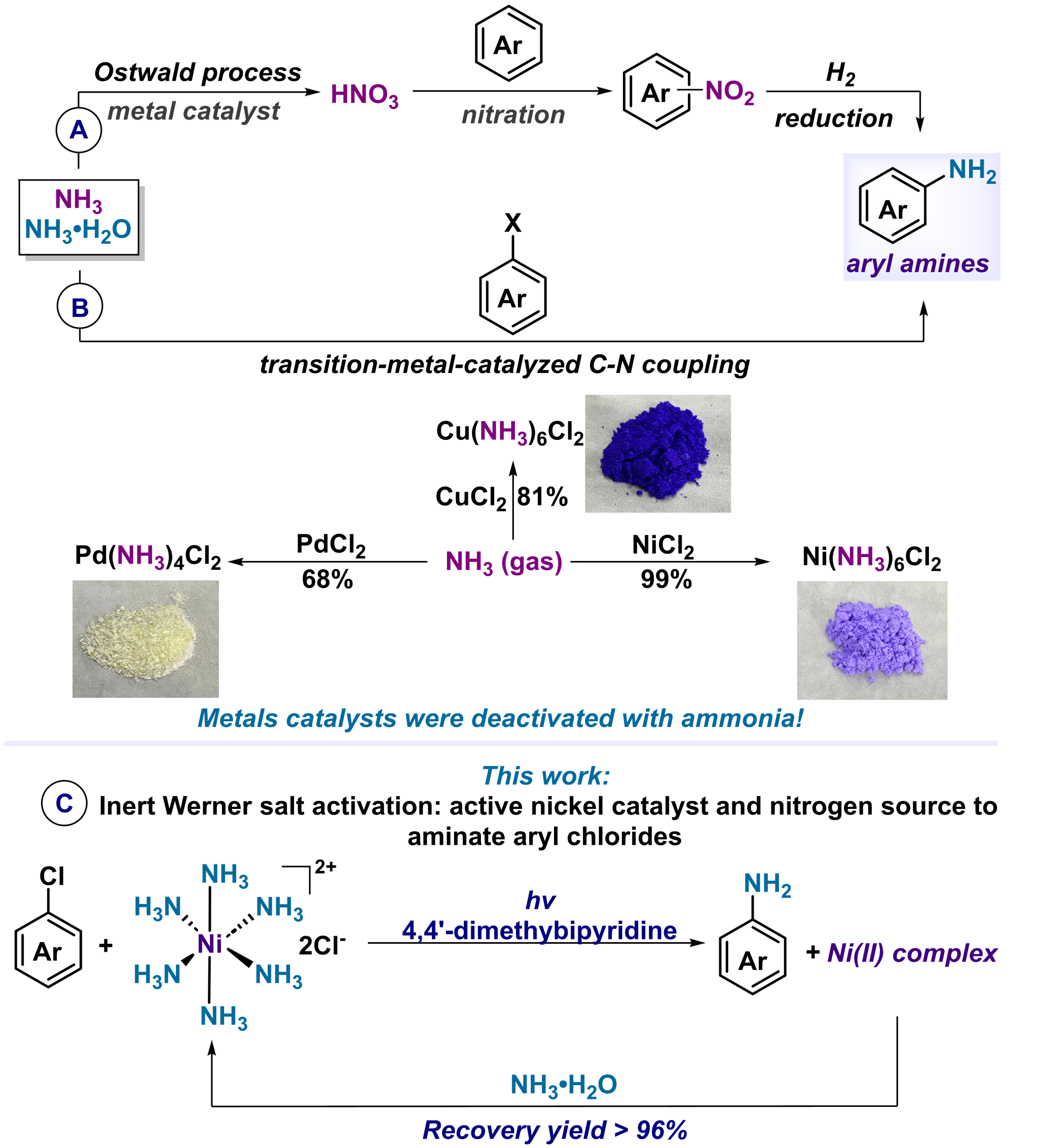 这项研究使用Werner Salt既充当胺源也提供了Ni催化剂,通过缓慢的NH3释放机过程,从而避免了催化剂中毒的问题。同时,Werner Salt可以很容易地回收和再利用,解决了过渡金属镍催化剂容易失活和难以回收的问题。该方法为伯芳基胺的合成提供了一种有效的新策略。