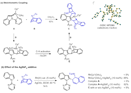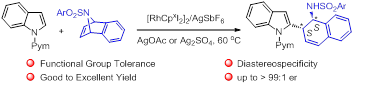 针对这类问题,李兴伟教授课题组选用N-杂苯并降冰片烯为偶联组分,采用偶联组分去对称化策略,设计和发展了手性铑催化C-H键活化-烯烃迁移插入-β-N消除串联体系,实现了N-嘧啶吲哚和N-杂降冰片烯类化合物氧化-还原中性的偶联反应,高对映选择性地合成了官能化吲哚。这是首例利用Rh(III)催化偶联组分去对称化策略实现C-H键对映选择性官能化的例子,为不对称C-H官能化领域提供了新思路。机理研究表明催化量的六氟锑酸银添加剂不仅活化了催化剂,而且在抑制吲哚3-位的碳氢键活化,保持铑催化剂反应活性中起到了至关重要的作用。