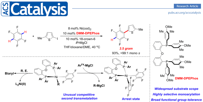 基于此,“生物正交化学-小分子探针团队”黄治炎课题组在深入认识多氟苯格氏试剂稳定性和官能团兼容性基础上,采用实验室发展的手性膦配体(DMM-DPEPhos)与镍形成的复合物为催化剂,在温和条件下,首次以不稳定的多氟芳基格氏试剂为偶联底物,实现了这类多氟芳烃的选择性单芳基化。