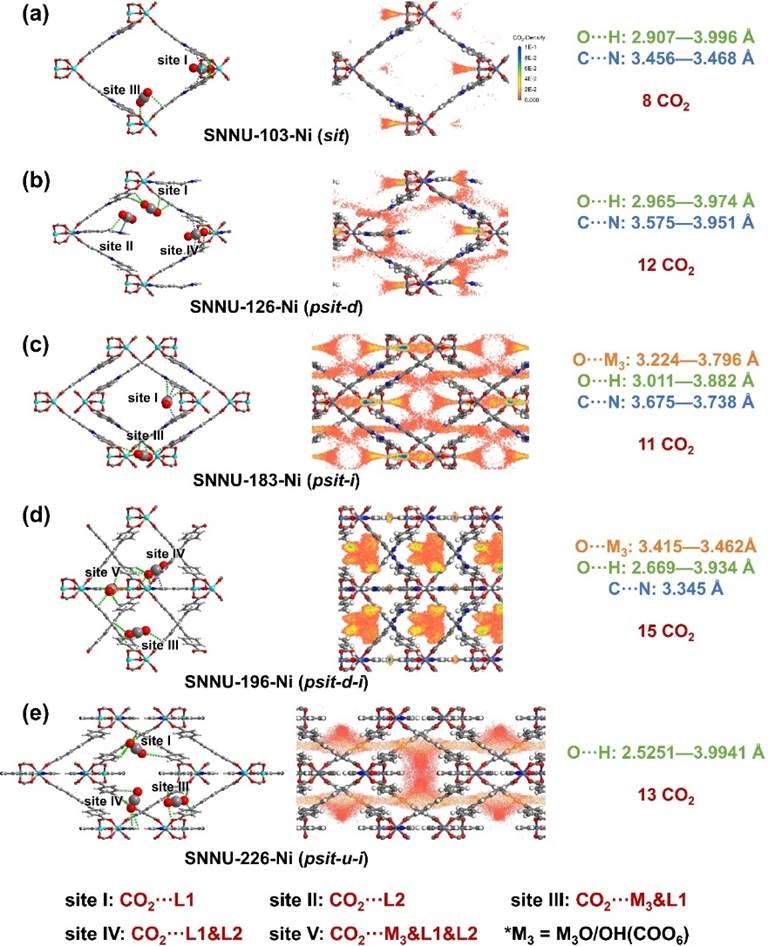 GCMC模拟计算揭示了不同MOF中CO2的吸附位点与分布特征。结果表明,CO2主要通过O···M3、O···H和C···N相互作用与框架结合。随着分区模式的演化,吸附位点数量与分布密度显著提升:母体SNNU-103-Ni仅形成O···H与C···N相互作用;SNNU-126-Ni引入L2配体后虽提升吸附量,但空间利用有限;SNNU-183-Ni通过穿插结构产生了O···M3相互作用;而SNNU-196-Ni和SNNU-226-Ni在多类型位点的协同作用下实现了更强的CO2结合能力。