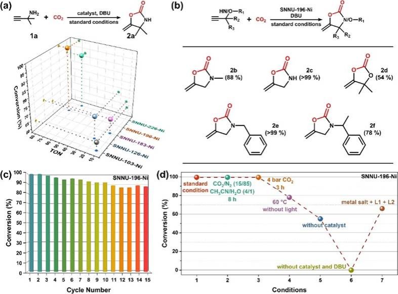 多样化的孔结构与丰富的Lewis酸/碱位点为CO2转化提供了理想反应环境。以CO2与炔胺的光催化环化为模型反应,研究发现SNNU-196-Ni表现出最优的光催化性能,在常温常压下可实现>99%的转化率和高周转数(TON = 74),并在15次循环后仍保持>86%的活性,显示出优异的稳定性与可重复性。其优异性能源于LGS-PSP策略带来的高密度且均匀分布的Lewis酸/碱活性位点。SNNU-196-Ni在稀释、加湿及低CO2分压条件下均保持高转化率。与传统单一分区的MOF相比,SNNU-196-Ni在催化活性、条件温和性及稳定性方面均显著优越,凸显了LGS-PSP在构筑高效CO2转化催化剂中的独特优势。